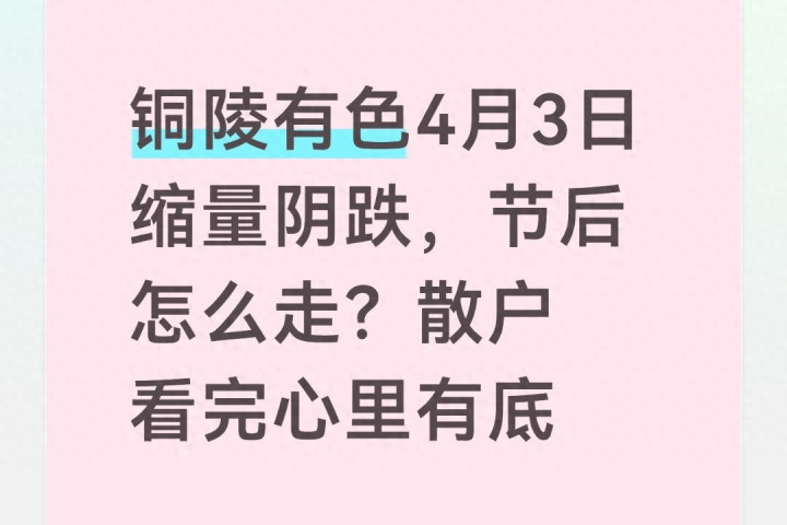 其实铜陵有色这次调整,既不是公司出了利空,也不是行业逻辑变了,就是市场短期情绪、资金节奏和节前避险心态叠加的正常走势。我全程用最接地气的大白话,结合4月3日最新的盘面数据、资金流向、铜行业最新动态,把这波阴跌的原因、节后可能的走势、散户该怎么操作,完完整整讲清楚,不搞晦涩术语、不胡乱预测、不制造焦虑,看完你就能理性判断,不用再盲目慌神。
